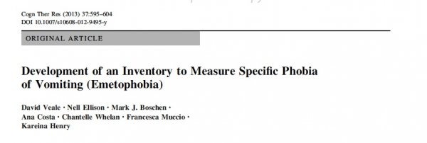 Veale, D, et al (2013). Development of an inventory to measure Specific Phobia of Vomiting (emetophobia). Cognitive Therapy and Research, 37:595-604 http://dx.doi.org/10.1007/s10608-012-9495-y. Download the paper
