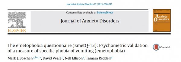 Boschen, M, Veale, D., Ellison, N., Reddell, T. (2013). The Emetophobia Questionnaire (EmetQ-13): Psychometric Validation of a Measure of Specific Phobia of Vomiting. Journal of Anxiety Disorders, 27(7): 670-677. http://dx.doi.org/10.1016/j.janxdis.2013.08.004