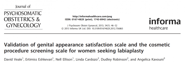 Veale, D, Eshkevari, E, Ellison, N, Cardozo, L, Robinson, D, & Kavouni, A. (2013). Validation of Genital Appearance Satisfaction Scale and COPS-L. Journal of Psychosomatic Obstetrics and Gynecology, 34(1): 46–52. http://dx.doi.org/10.3109/0167482X.2012.756865 Download the paper
