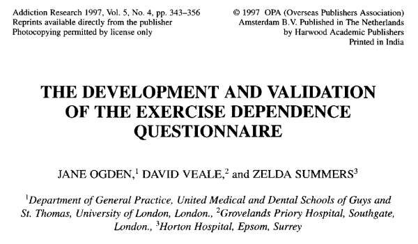 Ogden, J, Veale, D, Summers, Z (1997) Development and validation of the exercise dependence questionnaire. Addiction Research, 1997; 5: 343-356. http://dx.doi.org/10.3109/16066359709004348